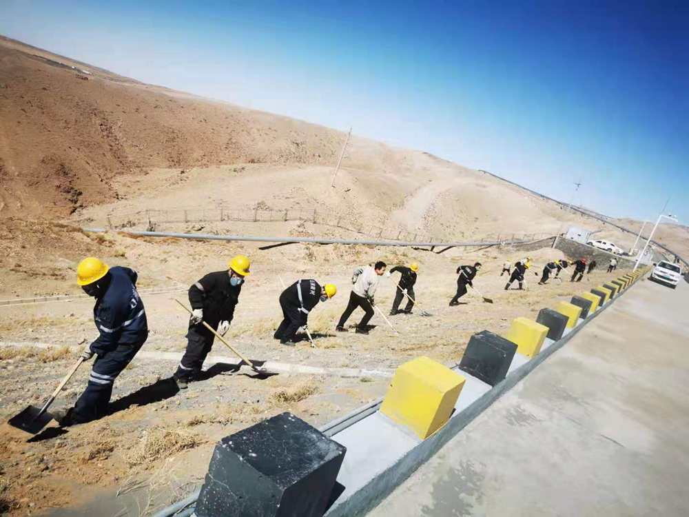 本次活動(dòng)重點(diǎn)對(duì)基礎(chǔ)壩兩側(cè)坡面進(jìn)行綜合治理,治理長(zhǎng)度約1.5公里。面對(duì)坡陡、風(fēng)大、黃沙亂舞的工作環(huán)境,黨員干部不懼困難、以身作則、俯沖一線,帶頭撿拾垃圾、清理尾砂、覆土灑水以及對(duì)安全警示牌進(jìn)行維護(hù)保養(yǎng)。廣大職工緊跟其后,或一字排開,或矩陣展開,忙碌的身影遍布整個(gè)坡面,鏟車的轟鳴聲、鐵锨的吱吱聲與狂風(fēng)的呼嘯聲琴簫合奏,在藍(lán)天、斜陽和荒山的襯托下,勾勒出一幅“聲與色”、“動(dòng)與靜”相得益彰的勞動(dòng)生產(chǎn)畫卷。